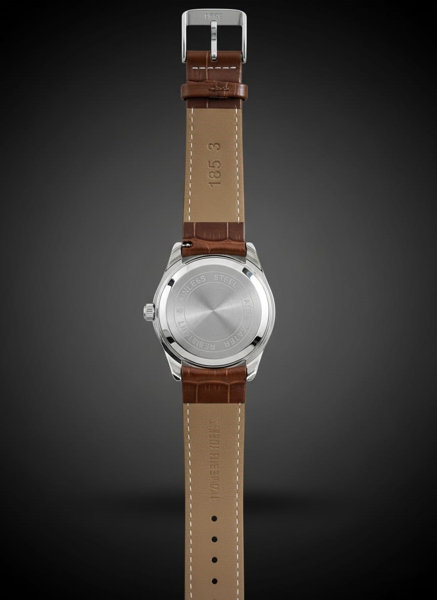 polished stainless steel case provides a robust yet elegant frame for the meticulously detailed